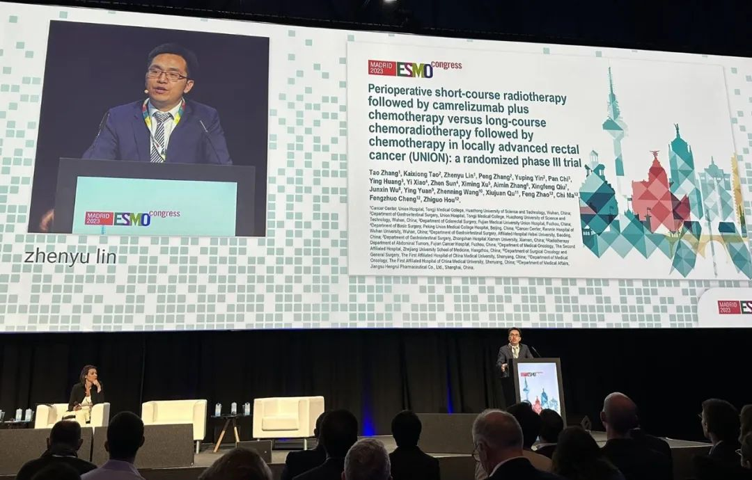 10月21日,DB真人医药创新药卡瑞利珠单抗的一项研究“新辅助短程放疗序贯卡瑞利珠单抗联合化疗对比长程放化疗序贯化疗治疗局部晚期直肠癌”随机对照Ⅲ期试验(UNION)亮相2023 ESMO大会优选口头报告现场。该研究由华中科技大学同济医学院附属协和医院张涛教授、陶凯雄教授担任主要研究者,华中科技大学同济医学院附属协和医院林振宇教授在大会现场报告了该重磅研究的结果1。此项研究是全球首个评估短程放疗序贯免疫治疗联合化疗治疗局部晚期直肠癌的Ⅲ期研究,已达到主要终点病理完全缓解(pCR),有望为直肠癌患者的治疗提供新策略。